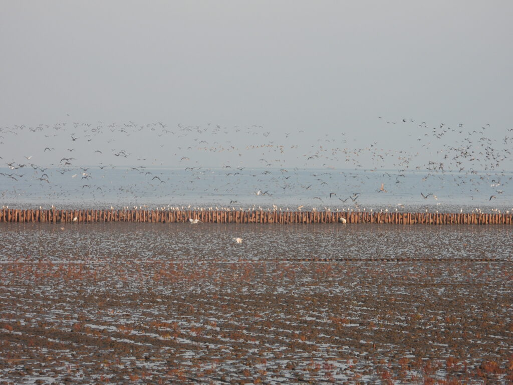6. In August, several members helping to assess the response of shorebirds and additional threatened waterbird species to the so-called “blue carbon” seawalls built across the tidal flat within what is supposed to be the strictly-protected Hwaseong Maehyangri Tidal Flat Wetland Protected Area in Gyeonggi Province. Our research found that many species of shorebird tried to avoid the seawall, reducing time available to e.g., globally Endangered Far Eastern Curlew for foraging and for roosting on the tidal flat;