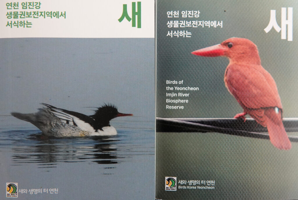 - Throughout the year, continuing our long-term conservation work in the Yeoncheon Imjin River Biosphere Reserve, with financial support from Yeoncheon County, Gyeonggi Province and a small grant from the EAAFP. As part of this, we continued to monitor cranes in the CCZ and Scaly-sided Mergansers within the Yeoncheon Imjin River Flyway Network Site; we gathered more data on Long-billed Plovers; and we surveyed multiple areas, with the aim of improving understanding of the distribution of birds and additional biodiversity. As in previous years, we then used this year’s research to propose restoration concepts and five key recommendations, which have been submitted to Yeoncheon County and Gyeonggi Province. English and Korean editions of our report on this work will be available on request to Birds Korea members. Also funded by Yeoncheon County and Gyeonggi Province, Birds Korea Yeoncheon also conducted several education programs, published a second small photo-guide; and with school students helped in the design of a signboard on Scaly-sided Mergansers which has now been erected in the Biosphere Reserve;