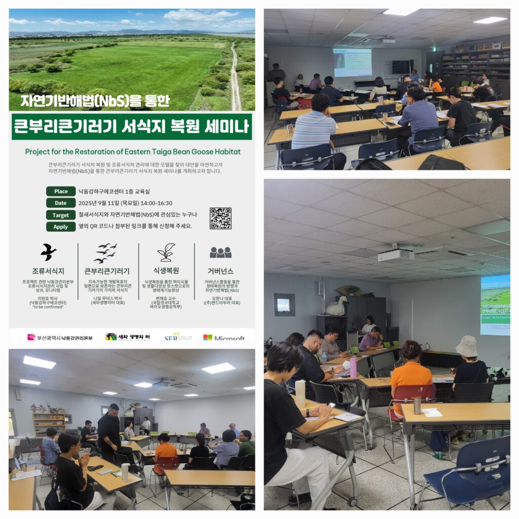 백로를 지내고 가을 바람을 느낄 수 있었던 9월 11일 (목) , 낙동강하구에코센터에서 의미있는 만남이 있었다. 프로젝트의 팀원을 비롯하여 창원, 포항, 울산, 예산, 서울 경기 등에서 어려운 걸음을 해주신 반가운 얼굴들을 뵐 수 있었다. 말 그대로 자랑스러운 회원이며 조류애호가들의 인플루언서인 새덕후님, 울산에서 활동 중이신 홍승민님, 달팽이 책방 대표 김*현 회원님, 이현주팀장님도 약속대로 귀한 시간을 내어주셨다. (사)생명그물 소속 활동가분들의 큰부리큰기러기에 대한 관심이 높았고 세미나 내내 오랜 경험과 관심을 지닌 인물들이 참여하신 덕에 웃음 띄며 지속가능한 발전과 생물다양성 보전이란 가치를 공유할 수 있는 시간이었다. 부산시 낙동강관리본부 담당자님들, 낙동강하구에코센터의 전문가님들도 다시 모시고 프로젝트의 타당성을 알림과 동시에 요긴한 정보와 조언을 듣고자 했던 본 세미나는 낙동강하구에코센터(센터장. 서지원 박사)의 도움을 받아 지난 7월 29일 낙동강관리본부와 ‘새와 생명의 터’가 체결한 조류 서식지 복원을 위한 업무협약을 배경으로 하고 있다.