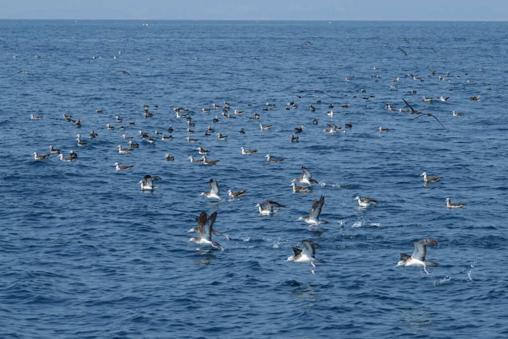 On August 2nd, under clear skies with calm seas and land-based temperatures peaking in Pohang at 37C and sea surface temperatures of 28C (according to the Windy App), it took less than 20 minutes to reach a large raft of globally Near Threatened Streaked Shearwater. This first raft included a lone globally Near Threatened Flesh-footed Shearwater.